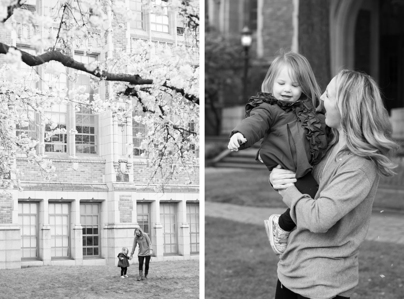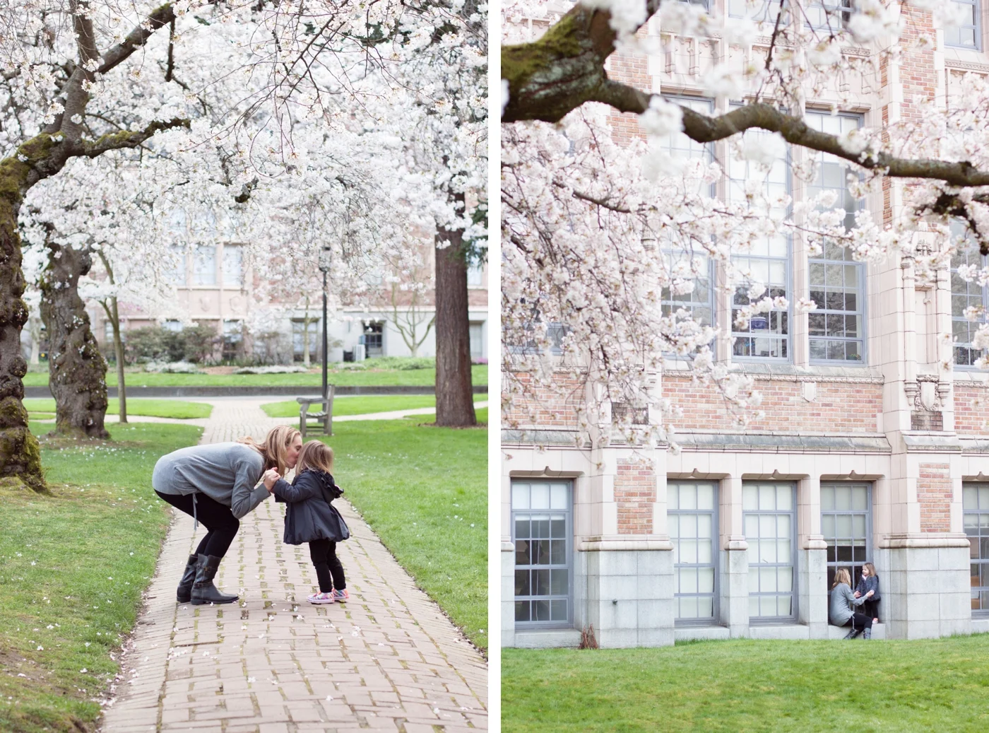 It seems that everyone in Seattle patiently follows “bloom watch,” and arrives at the University of Washington at the exact moment the cherry blossoms hit full bloom! It’s especially crazy when those full-bloom days fall on the weekend, as they did this year. To beat the crowds, Momma, Miss B, and I arrived on campus just after sunrise. While there were several photographers already set up with their equipment, we otherwise had the area to ourselves. What a fun place to play! Weeks later, Miss B still talks about the “pink trees” with her momma.
